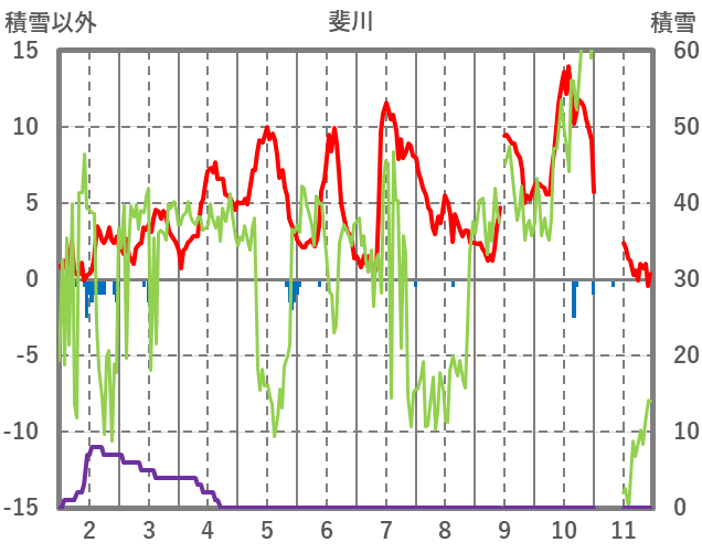 | 日 | 時 | 気温 | 降水 | 風向/風速 | 日照 | 積雪 | 降雪 |