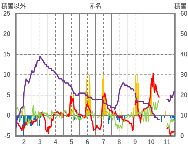 | 日 | 時 | 気温 | 降水 | 風向/風速 | 日照 | 積雪 | 降雪 |