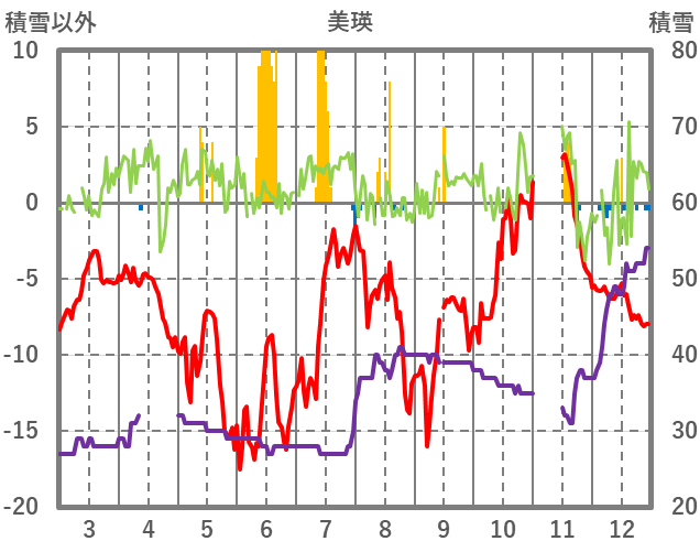 | 日 | 時 | 気温 | 降水 | 風向/風速 | 日照 | 積雪 | 降雪 |