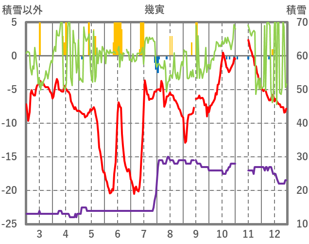 | 日 | 時 | 気温 | 降水 | 風向/風速 | 日照 | 積雪 | 降雪 |