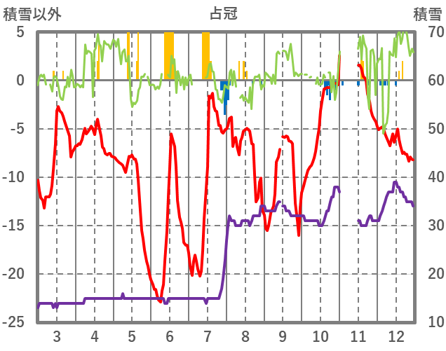 | 日 | 時 | 気温 | 降水 | 風向/風速 | 日照 | 積雪 | 降雪 |
