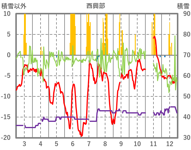 | 日 | 時 | 気温 | 降水 | 風向/風速 | 日照 | 積雪 | 降雪 |