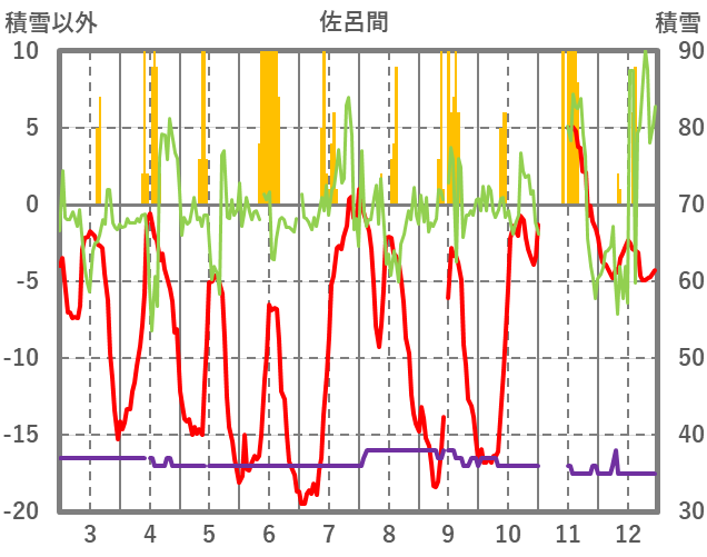 | 日 | 時 | 気温 | 降水 | 風向/風速 | 日照 | 積雪 | 降雪 |