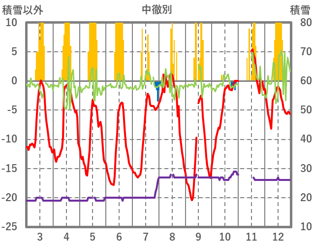 | 日 | 時 | 気温 | 降水 | 風向/風速 | 日照 | 積雪 | 降雪 |
