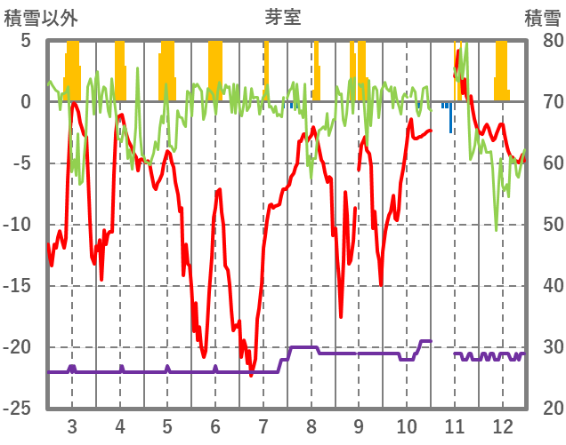 | 日 | 時 | 気温 | 降水 | 風向/風速 | 日照 | 積雪 | 降雪 |