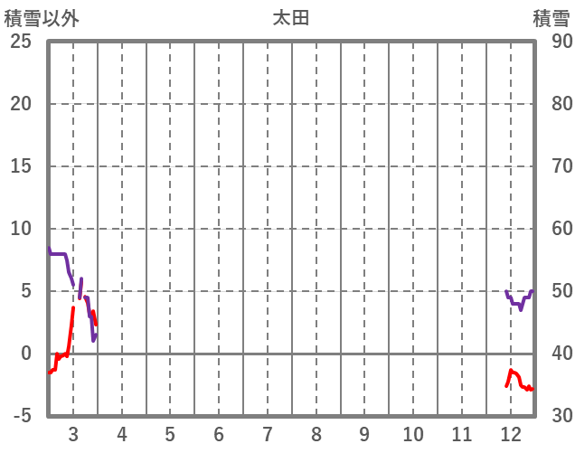 | 日 | 時 | 気温 | 降水 | 風向/風速 | 日照 | 積雪 | 降雪 |