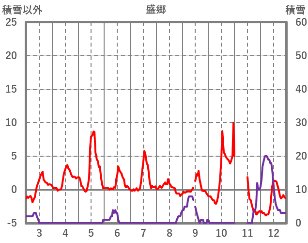 | 日 | 時 | 気温 | 降水 | 風向/風速 | 日照 | 積雪 | 降雪 |
