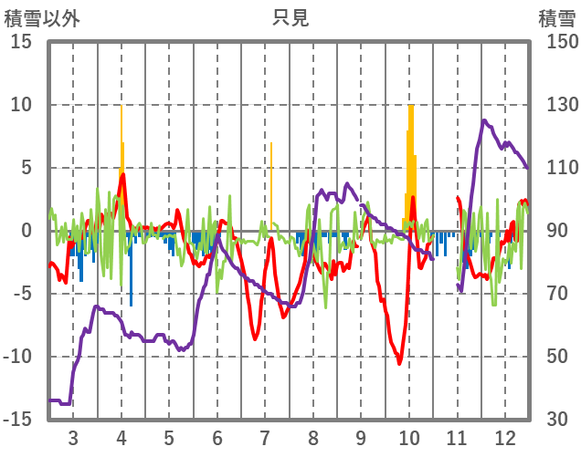 | 日 | 時 | 気温 | 降水 | 風向/風速 | 日照 | 積雪 | 降雪 |