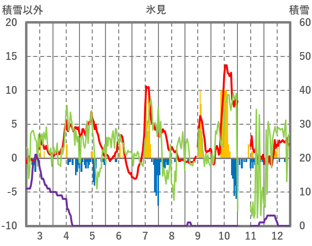 | 日 | 時 | 気温 | 降水 | 風向/風速 | 日照 | 積雪 | 降雪 |