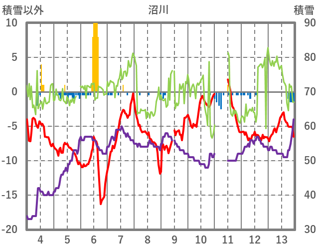 | 日 | 時 | 気温 | 降水 | 風向/風速 | 日照 | 積雪 | 降雪 |