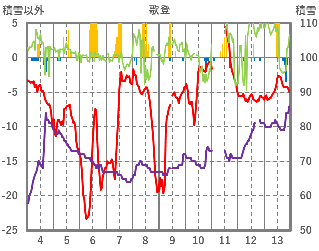 | 日 | 時 | 気温 | 降水 | 風向/風速 | 日照 | 積雪 | 降雪 |