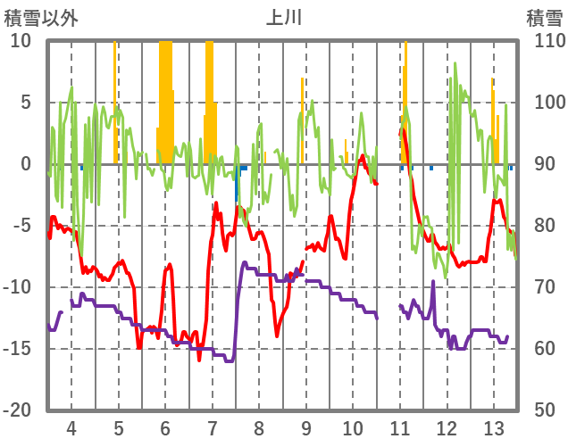 | 日 | 時 | 気温 | 降水 | 風向/風速 | 日照 | 積雪 | 降雪 |