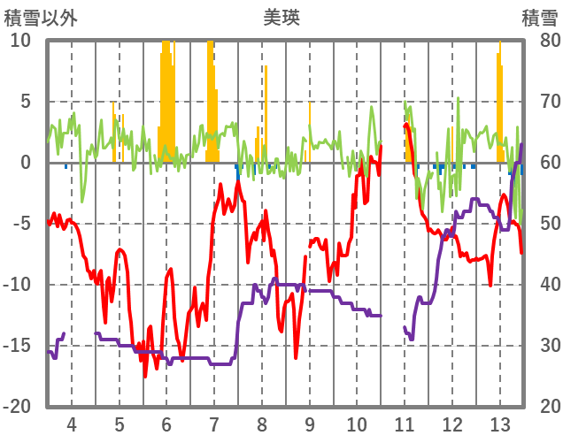 | 日 | 時 | 気温 | 降水 | 風向/風速 | 日照 | 積雪 | 降雪 |