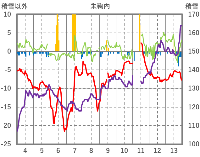 | 日 | 時 | 気温 | 降水 | 風向/風速 | 日照 | 積雪 | 降雪 |