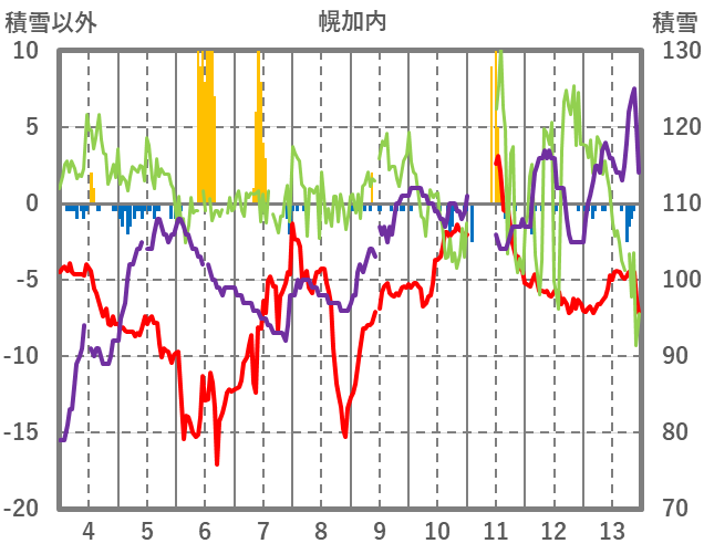 | 日 | 時 | 気温 | 降水 | 風向/風速 | 日照 | 積雪 | 降雪 |
