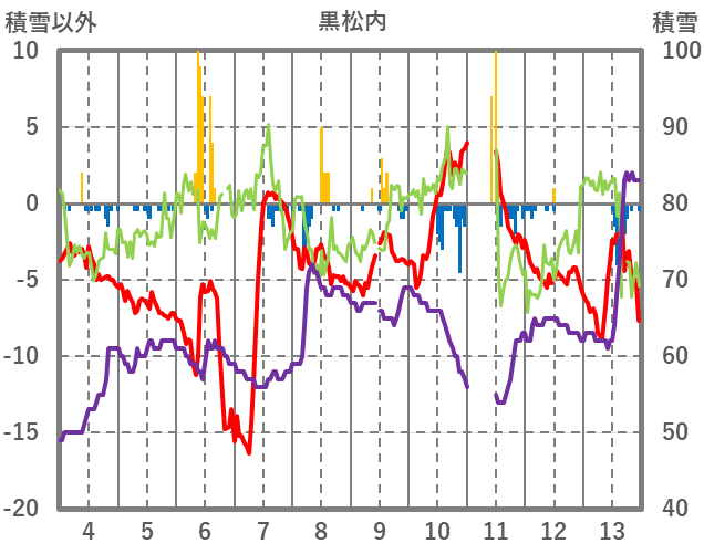 | 日 | 時 | 気温 | 降水 | 風向/風速 | 日照 | 積雪 | 降雪 |