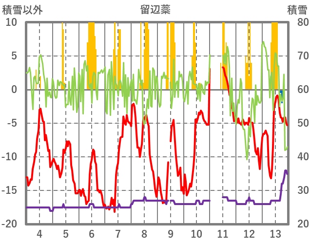 | 日 | 時 | 気温 | 降水 | 風向/風速 | 日照 | 積雪 | 降雪 |