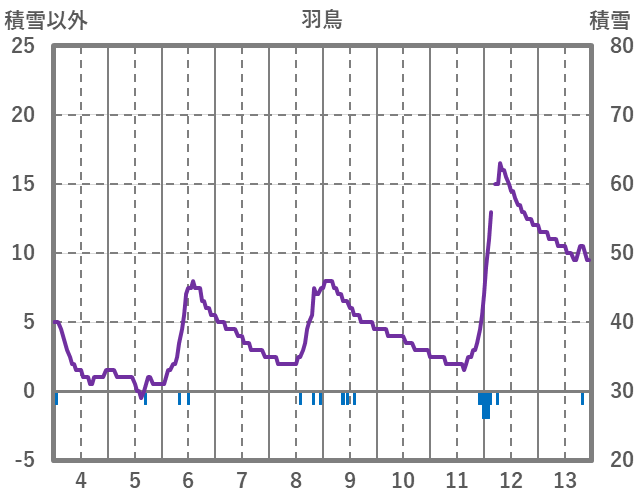 | 日 | 時 | 気温 | 降水 | 風向/風速 | 日照 | 積雪 | 降雪 |