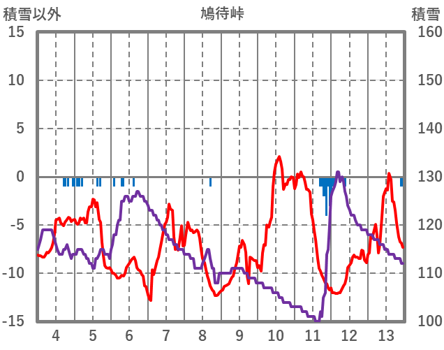 | 日 | 時 | 気温 | 降水 | 風向/風速 | 日照 | 積雪 | 降雪 |