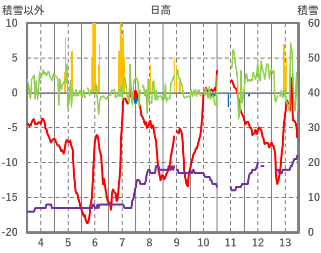 | 日 | 時 | 気温 | 降水 | 風向/風速 | 日照 | 積雪 | 降雪 |