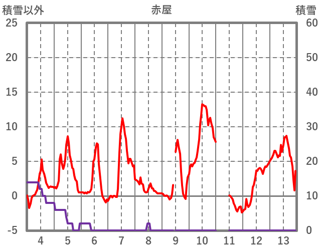 | 日 | 時 | 気温 | 降水 | 風向/風速 | 日照 | 積雪 | 降雪 |