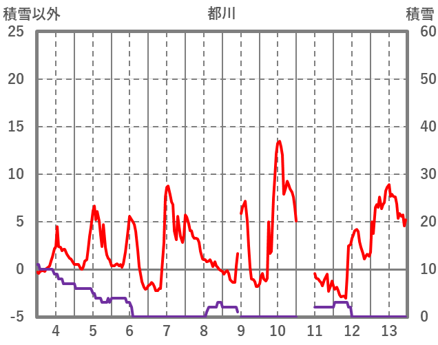 | 日 | 時 | 気温 | 降水 | 風向/風速 | 日照 | 積雪 | 降雪 |