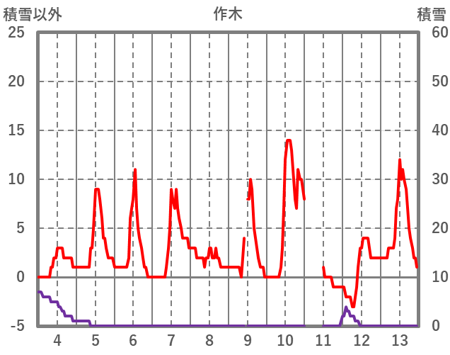 | 日 | 時 | 気温 | 降水 | 風向/風速 | 日照 | 積雪 | 降雪 |