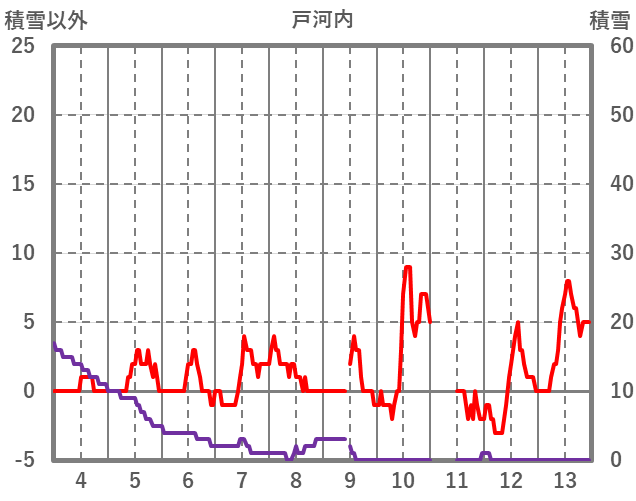 | 日 | 時 | 気温 | 降水 | 風向/風速 | 日照 | 積雪 | 降雪 |