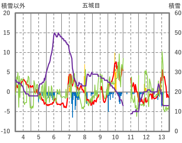 | 日 | 時 | 気温 | 降水 | 風向/風速 | 日照 | 積雪 | 降雪 |