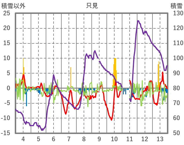 | 日 | 時 | 気温 | 降水 | 風向/風速 | 日照 | 積雪 | 降雪 |