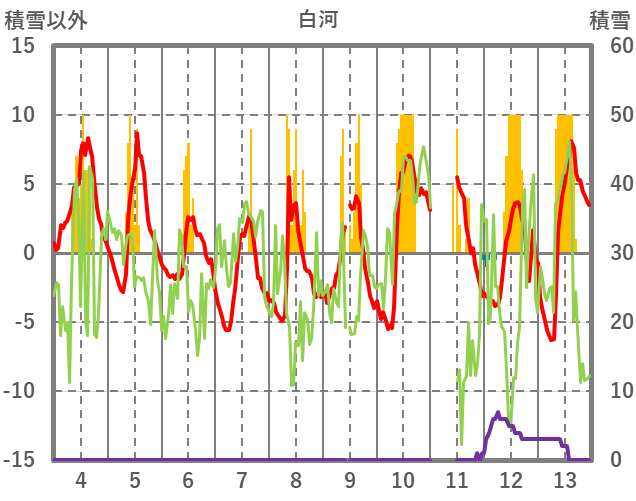 | 日 | 時 | 気温 | 降水 | 風向/風速 | 日照 | 積雪 | 降雪 |