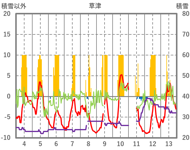 | 日 | 時 | 気温 | 降水 | 風向/風速 | 日照 | 積雪 | 降雪 |