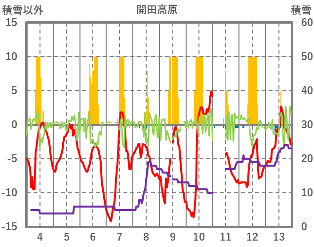 | 日 | 時 | 気温 | 降水 | 風向/風速 | 日照 | 積雪 | 降雪 |