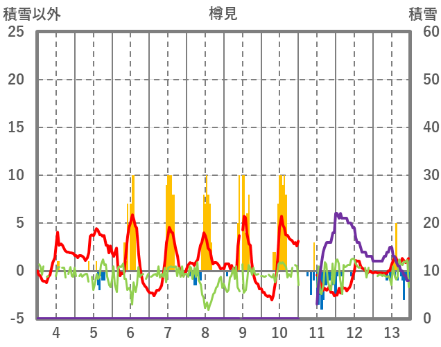 | 日 | 時 | 気温 | 降水 | 風向/風速 | 日照 | 積雪 | 降雪 |