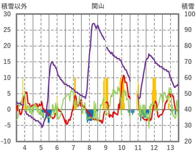 | 日 | 時 | 気温 | 降水 | 風向/風速 | 日照 | 積雪 | 降雪 |