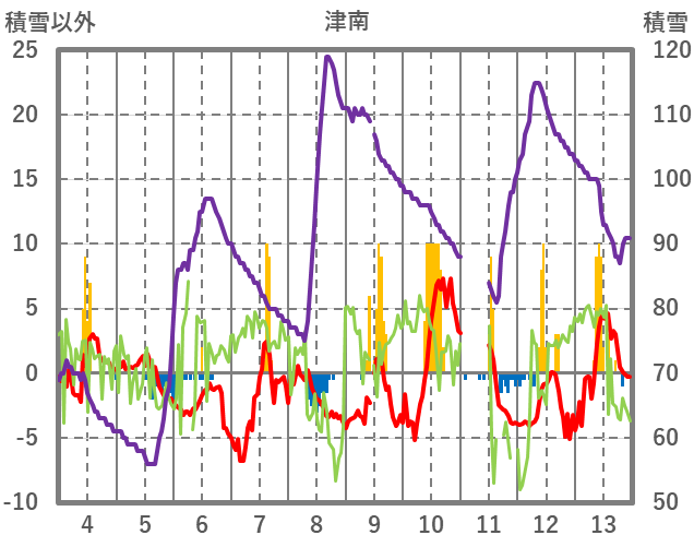 | 日 | 時 | 気温 | 降水 | 風向/風速 | 日照 | 積雪 | 降雪 |