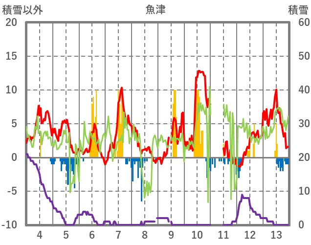 | 日 | 時 | 気温 | 降水 | 風向/風速 | 日照 | 積雪 | 降雪 |