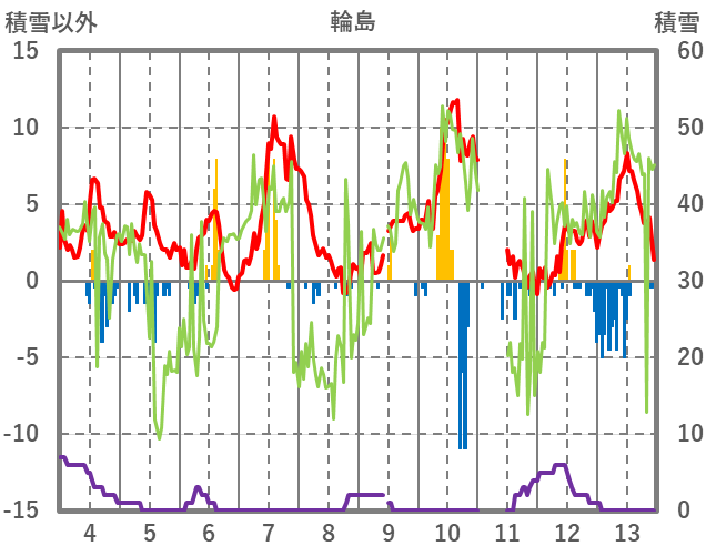 | 日 | 時 | 気温 | 降水 | 風向/風速 | 日照 | 積雪 | 降雪 |
