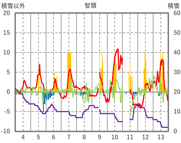 | 日 | 時 | 気温 | 降水 | 風向/風速 | 日照 | 積雪 | 降雪 |