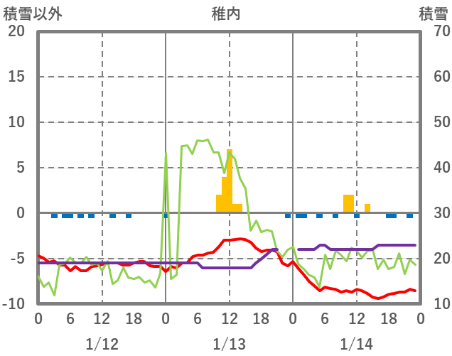 | 日 | 時 | 気温 | 降水 | 風向/風速 | 日照 | 積雪 | 降雪 |