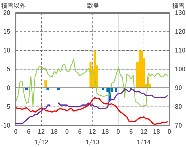 | 日 | 時 | 気温 | 降水 | 風向/風速 | 日照 | 積雪 | 降雪 |