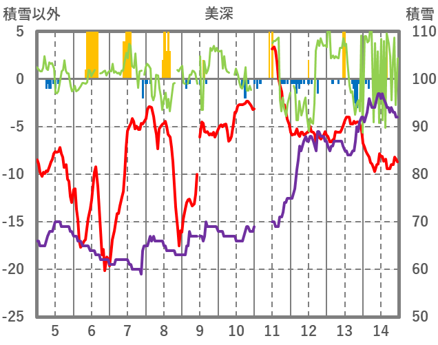 | 日 | 時 | 気温 | 降水 | 風向/風速 | 日照 | 積雪 | 降雪 |