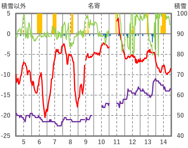 | 日 | 時 | 気温 | 降水 | 風向/風速 | 日照 | 積雪 | 降雪 |