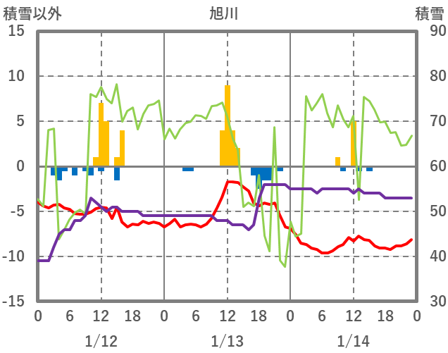 | 日 | 時 | 気温 | 降水 | 風向/風速 | 日照 | 積雪 | 降雪 |