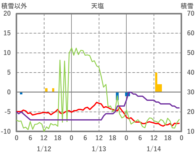 | 日 | 時 | 気温 | 降水 | 風向/風速 | 日照 | 積雪 | 降雪 |