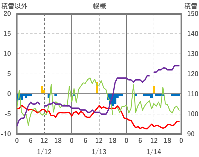 | 日 | 時 | 気温 | 降水 | 風向/風速 | 日照 | 積雪 | 降雪 |