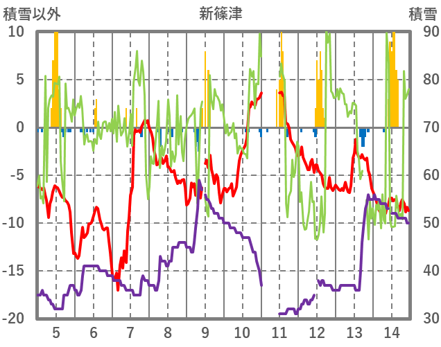 | 日 | 時 | 気温 | 降水 | 風向/風速 | 日照 | 積雪 | 降雪 |