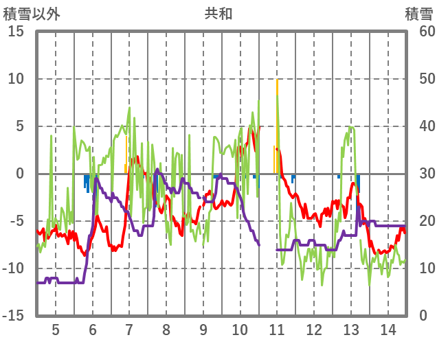 | 日 | 時 | 気温 | 降水 | 風向/風速 | 日照 | 積雪 | 降雪 |