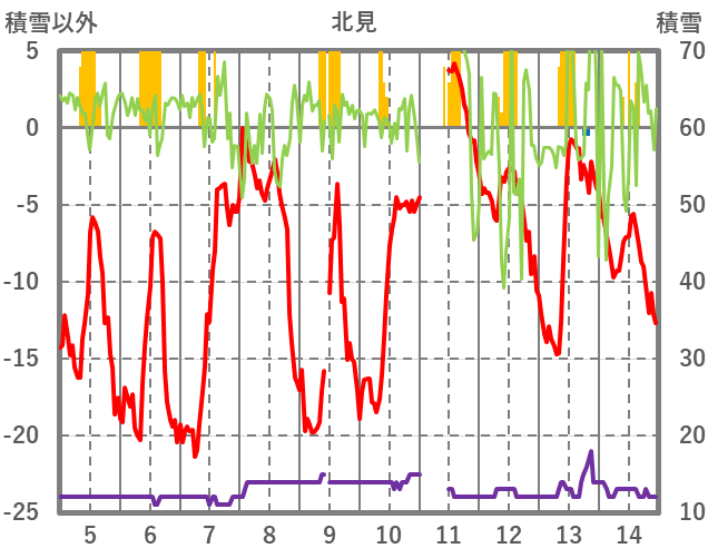 | 日 | 時 | 気温 | 降水 | 風向/風速 | 日照 | 積雪 | 降雪 |
