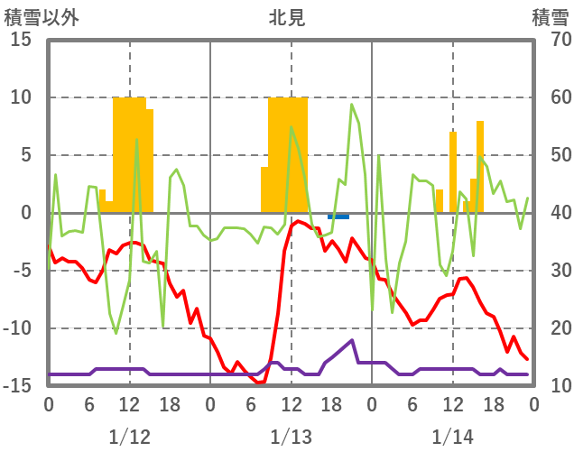 | 日 | 時 | 気温 | 降水 | 風向/風速 | 日照 | 積雪 | 降雪 |